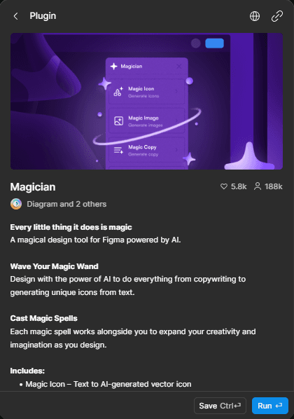 Next, we have "Magician" which has several tools such as creating icons through a prompt, a "Copywriting" function that offers different sentence structures or texts based on your existing text, as well as a "text to image" feature directly integrated into Figma.
